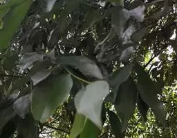 4、川桂,常绿高大乔木。枝紫灰褐色,光滑。单叶互生或近对生;革质,卵形至长卵形,长8-15cm,宽3-5cm,先端渐尖而顶点钝,基部楔状或钝形,全缘,上面绿色,无毛,下面微被白粉,幼时有白色绢状毛,后渐脱落;具离基3出脉,在下面不隆起。花小,白色,成圆锥花序或伞形花序;总花梗细长,长1-6cm,光滑或微被毛,小花梗丝状,先端渐粗,具细毛;花被6裂,内外皆疏生绢状细毛;雄蕊与雌蕊均与前种相似。浆果基部具截形之宿存萼筒,全缘。花期5-6月。果期7-10月。