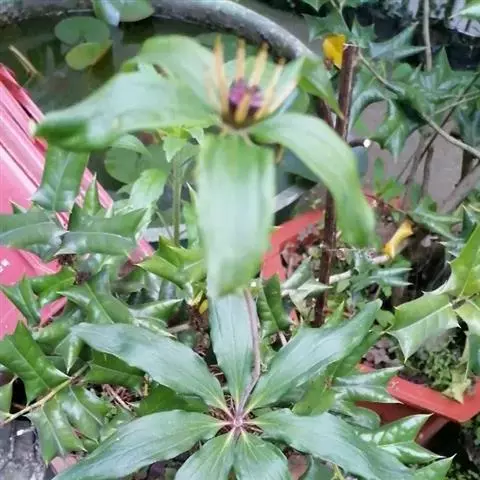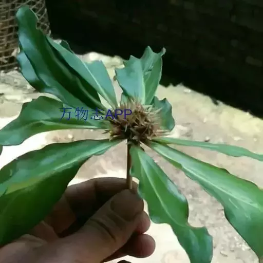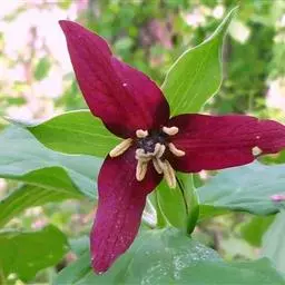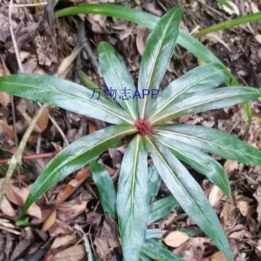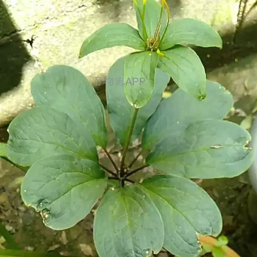 七叶一枝花 七叶一枝花植株高35-100cm,无毛;根状茎粗厚,直径达1-2.5cm,外面棕褐色,密生多数环节和许多须根。茎通常带紫红色,直径(0.8-)1-1.5cm,基部有灰白色干膜质的鞘1-3枚。叶(5-)7-10枚,矩圆形、椭圆形或倒卵状披针形,长7-15cm,宽2.5-5cm,先端短尖或渐尖,基部圆形或宽楔形;叶柄明显,长2-6cm,带紫红色。花梗长5-16(30)cm;外轮花被片绿色,(3-)4-6枚,狭卵状披针形,长(3-)4.5-7cm;内轮花被片狭条形,通常比外轮长;雄蕊8-12枚,花药短,长5-8mm,与花丝近等长或稍长,药隔突出部分长0.5-1(-2)mm;子房近球形,具稜,顶端具一盘状花柱基,花柱粗短,具(4-)5分枝。蒴果紫色,直径1.5-2.5cm,3-6瓣裂开。种子多数,具鲜红色多浆汁的外种皮。花期4-7月,果期8-11月。
