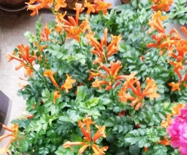 常有上痂状凸起。叶对生,奇数羽状复叶;总叶柄长3-6cm,小叶柄短;小叶多为7枚,卵形至阔椭圆形,长1-2.5cm,先端短尖或钝,基部阔楔形,边缘有不甚规则的锯齿,秃净或于背脉腋内有绵毛。总状花序顶生;萼钟状,5齿裂;喜温暖、湿润和充足的阳光。不耐寒,不耐阴。生长适温:4-10月为20-24度;10月至翌年4月为12-16度。冬季温度不可低于8度。萌发力强。对土壤选择不严,喜排水良好的砂壤土。切忌积水。在云南省西双版纳可全年开花,花橙红色至金黄色。北方盆栽温度适宜时,花期为8-11月;蒴果扁线形,多不结实,但也有十分结实的。