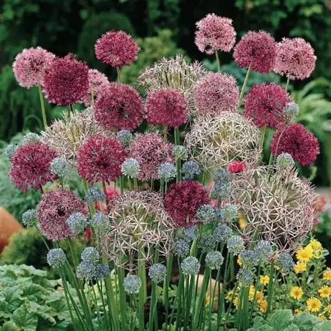 花葶圆柱状,高10-30厘米,下部被叶鞘;总苞单侧开裂,宿存;伞形花序半球状至球状,具多而通常密集的花;小花梗近等长,从与花被片近等长直到比其长1倍,基部无小苞片;花淡红色、淡紫色至紫红色,大;花被片卵状矩圆形,长6-9毫米,宽3-5毫米,先端钝圆,内轮的常比外轮的长;花丝近等长,为花被片长度的1/2-2/3,基部合生并与花被片贴生,内轮的基部约1/2扩大成卵形,外轮的锥形;子房倒卵状球形;花柱略比子房长,不伸出花被外。