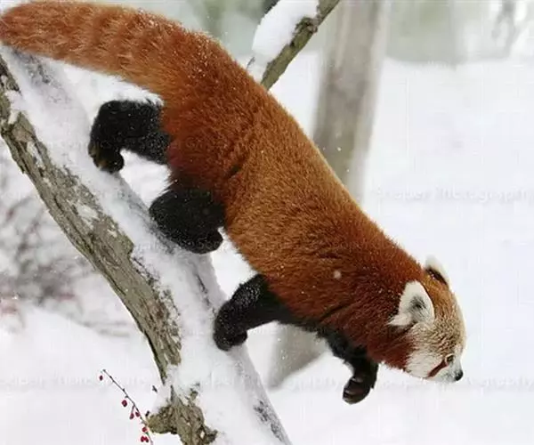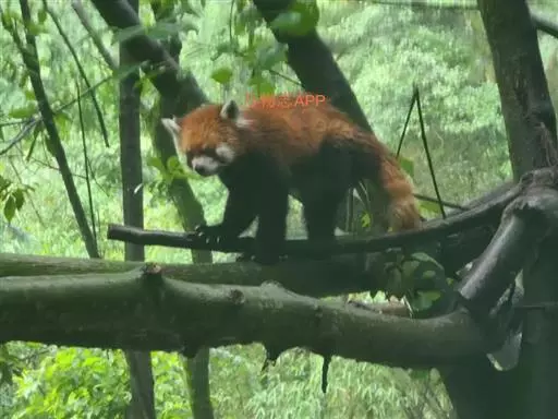 小熊猫幼仔 于树枝上。善于攀爬,往往能爬到高而细的树枝上休息或躲避敌害。由于它脚底长有厚密的绒毛,因此也适于在林下滑湿的苔藓地、或岩石上行走。走路时前足内弯,步态蹒跚,与熊相似。平时行动缓慢,性情较为温驯,很少发出叫声。听觉与视觉较迟钝,嗅觉也不特别灵敏。一般单只或成对或集小群活动。无冬眠习性,下雨、雪时多在岩石缝隙中或大树树荫深处躲避雨雪。