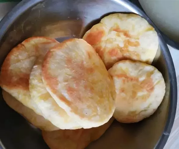 5.平底锅以大火烧热,下馅饼入锅略按扁烘一会儿,即倒入适量的花生油,煎成两面金黄,香味四出,即可盛出供食。