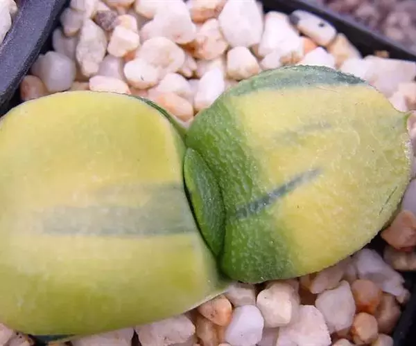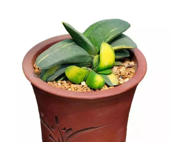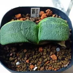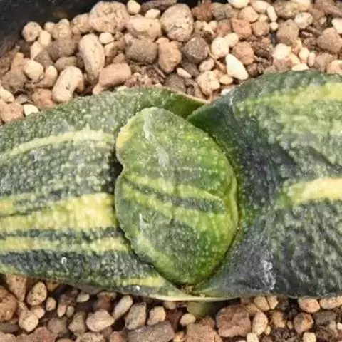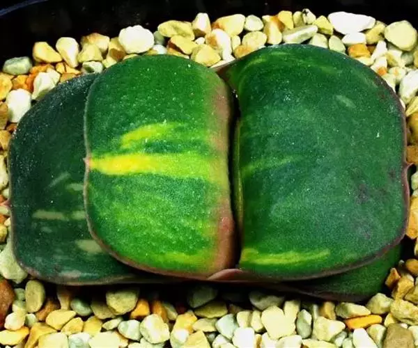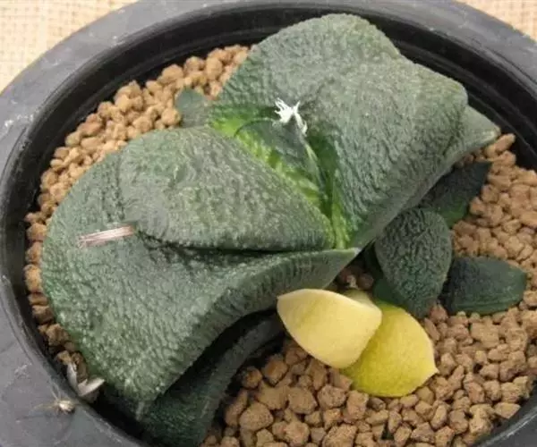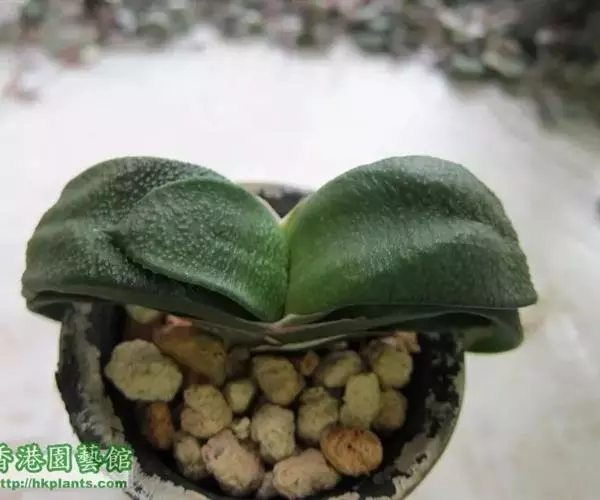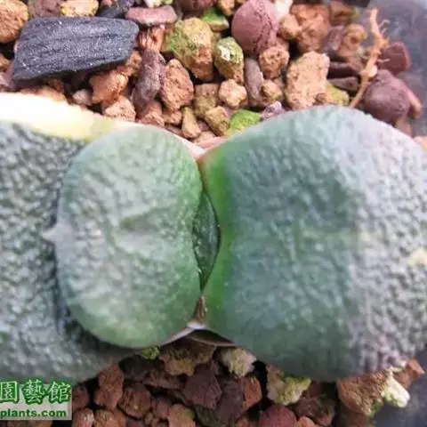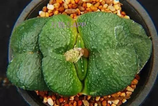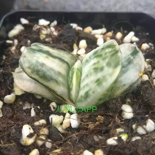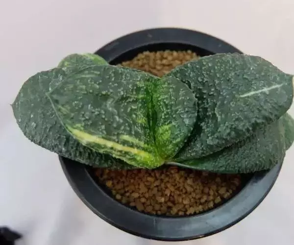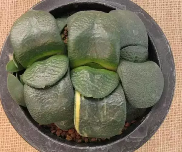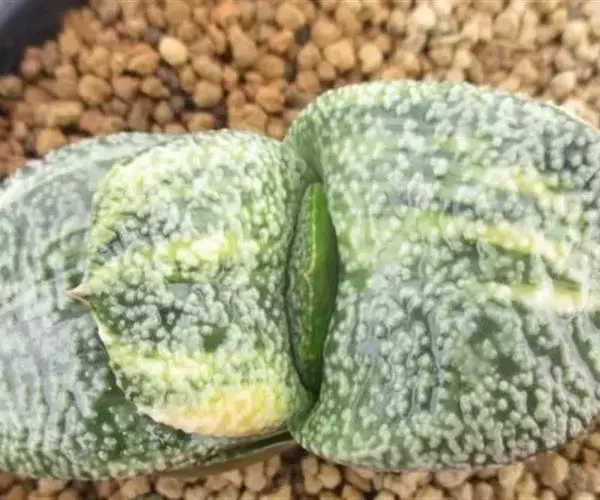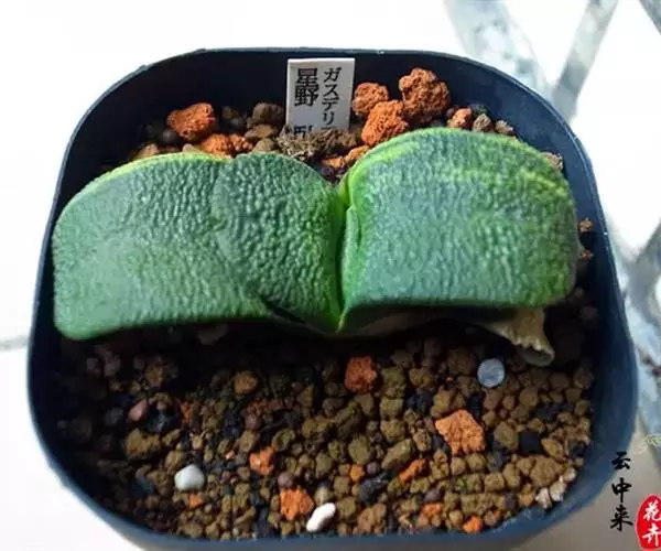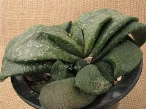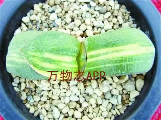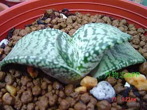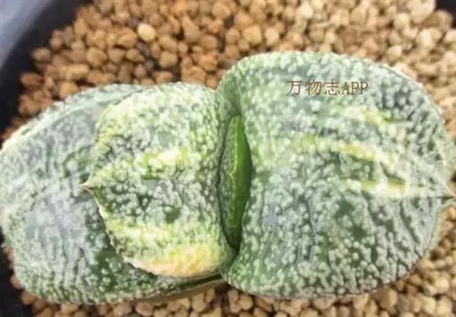 幼株叶两列叠生,肉质厚,长3~5厘米、宽3厘米。叶舌状,先端有尖,表皮有白色小疣,叶缘和叶尖都有小疣。成年株叶排列成莲座状,直径6~10厘米,单叶长5~6厘米、宽3~4厘米、厚1厘米,叶尖背面有明显的龙骨突,部分叶表面小疣脱落。
