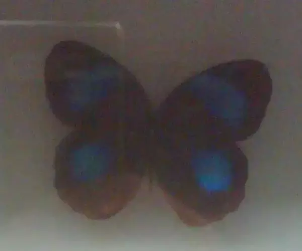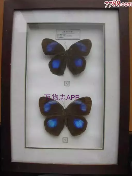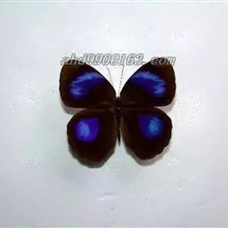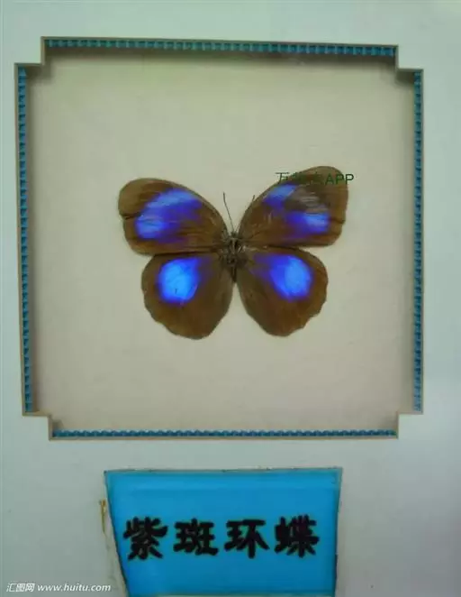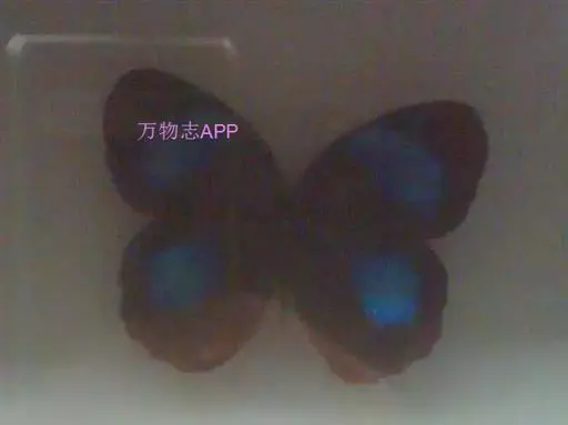 紫斑环蝶翅展80-90mm,翅圆形,外缘弧状,底色深褐,前后翅中域有大淡蓝白色斑;翅反面黑褐色,外缘淡褐色,前、后翅有3条暗色带,后翅rs、cu1.室各有1个眼斑。 其翅膀表面分布着两种类型的鳞片,呈覆瓦状排列,均布于整个翅膀表面。其中一类鳞片对蓝色结构色的产生起着关键性作用。