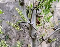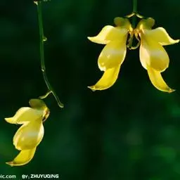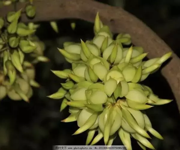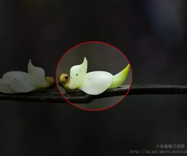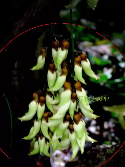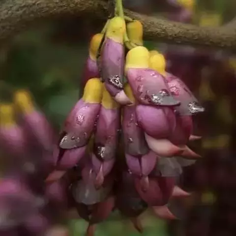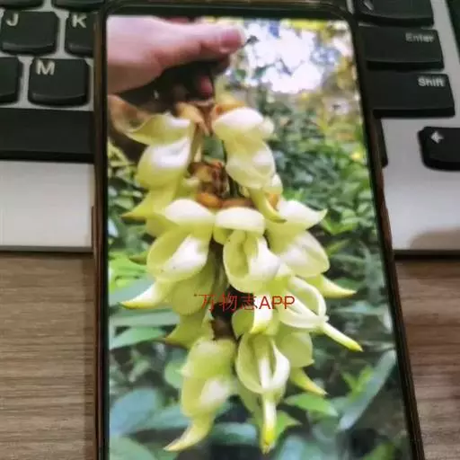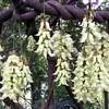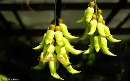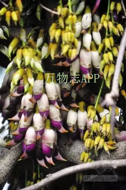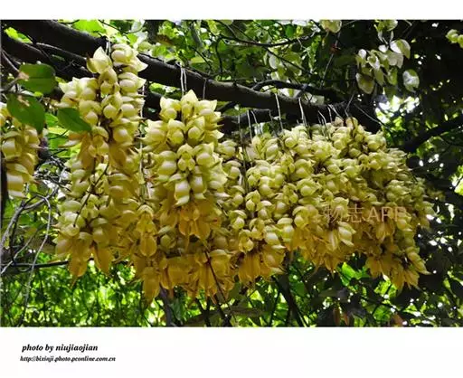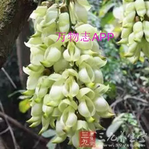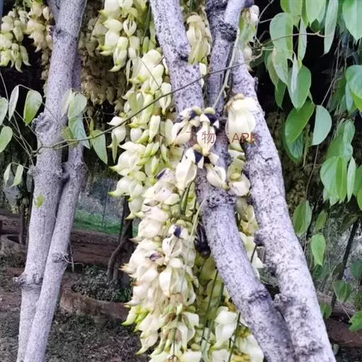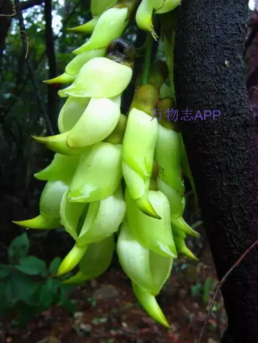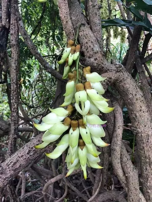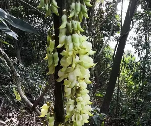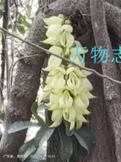 白花油麻藤(Mucuna birdwoodiana Tutcher),蝶形花科黎豆属,又名禾雀花、常绿木质大型藤本。该种生长迅速,蔓茎粗壮,叶繁荫浓,茎长可达30米以上,其生命力顽强,能盘树缠绕,越冠飞枝,攀石穿缝。其花序悬挂于悠长盘曲的老茎上,吊挂成串,每串二、三十朵,串串下垂。酷似无数白中带翠,如玉温润的小鸟栖息在枝头。