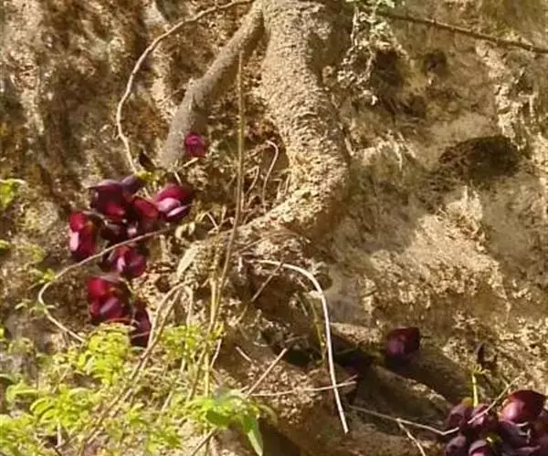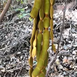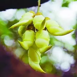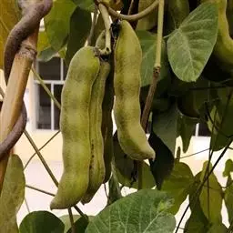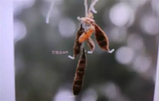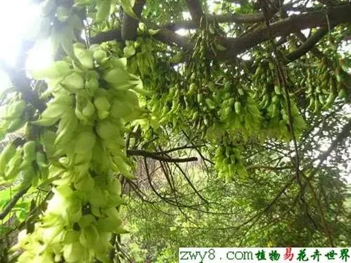 果木质,带形,长30-45厘米,宽3.5-4.5厘米,厚1-1.5厘米,近念珠状,密被红褐色短绒毛,幼果常被红褐色脱落的刚毛,沿背、腹缝线各具宽3-5毫米的木质狭翅,有纵沟,内部在种子之间有木质隔膜,厚达4毫米;种子5-13颗,深紫黑色,近肾形,长约2.8厘米,宽约2厘米,厚8-10毫米,常有光泽,种脐为种子周长的1/2-3/4。花期4-6月,果期6-11月。