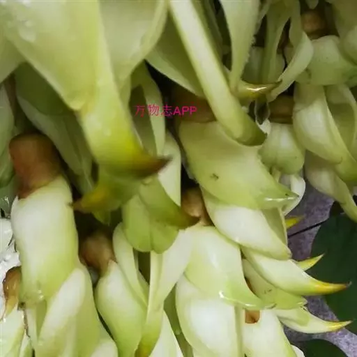总状花序生于老枝上或生于叶腋,长20-38厘米,有花20-30朵,常呈束状;苞片卵形,长约2毫米,早落;花梗长1-1.5厘米,具稀疏或密生的暗褐色伏贴毛;小苞片早落;花萼内面与外面密被浅褐色伏贴毛,外面被红褐色脱落的粗刺毛,萼筒宽杯形,长1-1.5厘米,宽1.5-2.5厘米,2侧齿三角形,长5-8毫米,最下齿狭三角形,长5-15毫米,上唇宽三角形,常与侧齿等长;花冠白色或带绿白色,旗瓣长3.5-4.5厘米,先端圆,基部耳长4毫米,翼瓣长6.2-7.1厘米,先端圆,瓣柄长约8毫米,密被浅褐色短毛,耳长约5毫米,龙骨瓣长7.5-8.7厘米,基部瓣柄长7-8毫米,耳长不过1毫米,密被褐色短毛;雄蕊管长5.5-6.5厘米;子房密被直立暗褐色短毛。