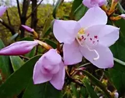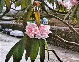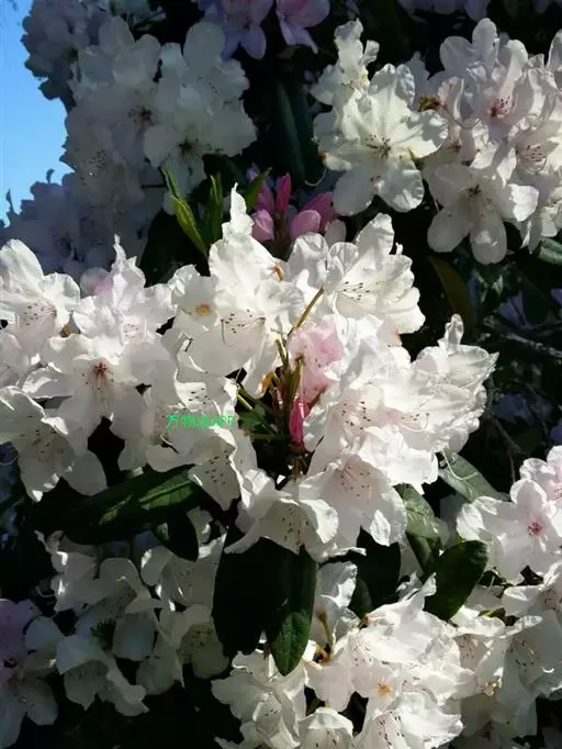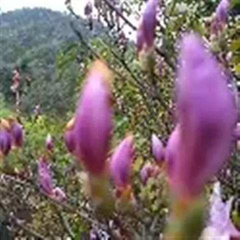 高山杜鹃的形态特征:常绿灌木或小乔木,株高1-3米,枝条粗壮,叶丛生枝顶,厚革质,长6-12厘米,宽2-5厘米,4-5月开花,花型以套瓣、重瓣为主,也有少量单瓣,花期1个月左右。花色有白色、粉色、淡红、桃红、黄色等。一般生长在海拔600-800米的山野间,适应性强,经过人工驯化、培育可望成为园林绿地中常绿观赏植物。