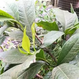 2.白藻病。发病初期叶面上出现灰白色至黄褐色小圆斑点,后逐渐扩大成放射状或纤维状纹理,表面呈褐色天鹅绒毛状而稍隆起,后期变成灰白色平滑病斑。防治方法:应注意通风透光,雨后及时排水;染病后可喷洒50%托布津500倍液防治。