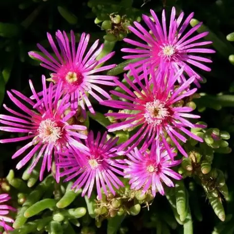 心叶日中花(学名:Mesembryanthemum cordifolium L. f.)是番杏科,日中花属多年生常绿草本。茎斜卧,铺散,长30-60厘米,有分枝,稍带肉质,无毛,具小颗粒状凸起。叶对生,叶片心状卵形,扁平,顶端急尖或圆钝具凸尖头,基部圆形。花单个顶生或腋生,花梗长1.2厘米;花萼长8毫米,裂片4;花瓣红紫色,匙形;雄蕊多数;子房4室。蒴果肉质,种子多数。花期7-8月。