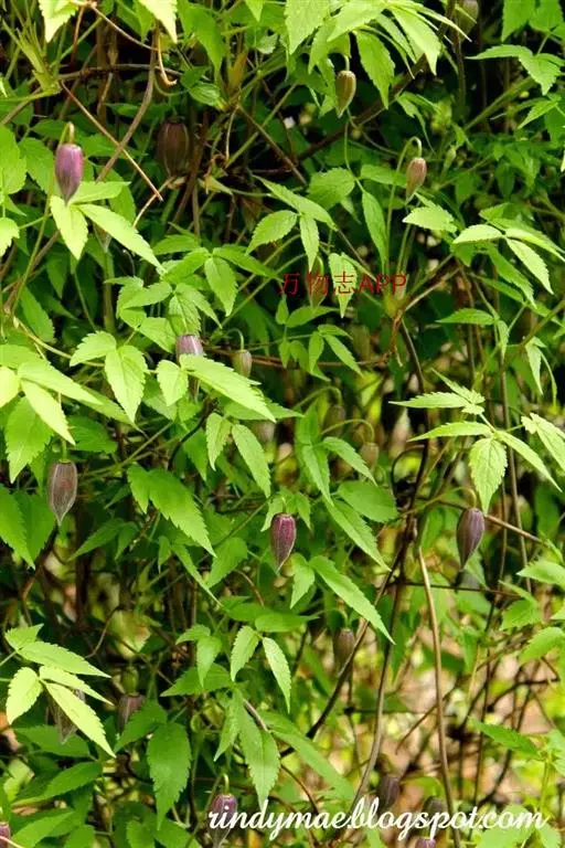 多年生 攀援草质藤本。老枝近于无毛,当年生枝具开展的柔毛。三出复叶、羽状复叶或二回三出复叶,连叶柄长9-15厘米,小叶3-9(-15)枚;小叶片卵状披针形或窄卵形,长3-6厘米, 宽1.5-2.5厘米,顶端渐尖,基部阔楔形或圆形,常偏斜,边缘有整齐的锯齿,表面被稀疏紧贴的柔毛或两面无毛,叶脉在表面平坦,在背面隆起;小叶柄短或长达8毫米;叶柄长3-6厘米,无毛,基部膨大隆起。
