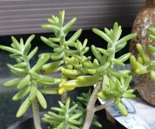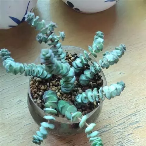 多年生肉质植物,植株呈小灌木状,高20-30厘米,多分枝。叶片松散地簇生于分枝顶部,叶肉质,圆柱形,表面平整光滑,稍向上内弯,顶端圆钝较基部稍细,叶长3-4厘米,粗约0.6厘米,叶色灰绿或浅蓝绿色。在阳光充足的条件下,叶先端呈橙色或橙黄色,在冷凉季节或温差较大、阳光充足环境下尤为明显。老株或植株生长不良时,茎下部叶片萎缩或脱落,并长出气生根。春季开黄色小花。 八千代