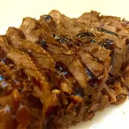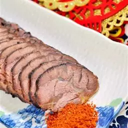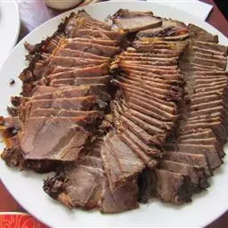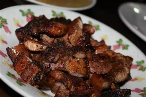 4、从炉口封闭时算起,过45分钟烤肉既熟,掀开大锅,抬出烤肉挂起,用刀刮去猪皮上焦糊的外层,而后取肉切成薄片即可食用。