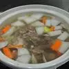 2、番茄切成块、青甜椒切成粗丝,加入锅中再继续炖半小时。如汤汁较多可加入淀粉将汤汁收浓。