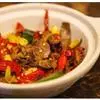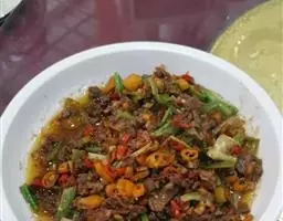 1、菜油烧热,下辣椒粉、茴香和大蒜片炒出香味来,下牛肉块炒至变色。加水和盐烧开,改小火炖约一小时。