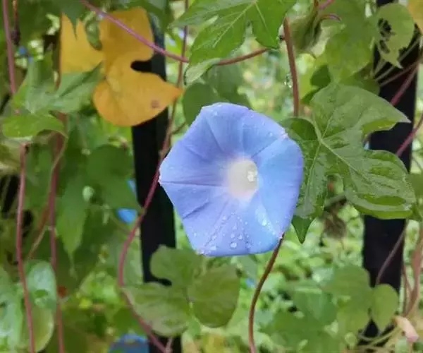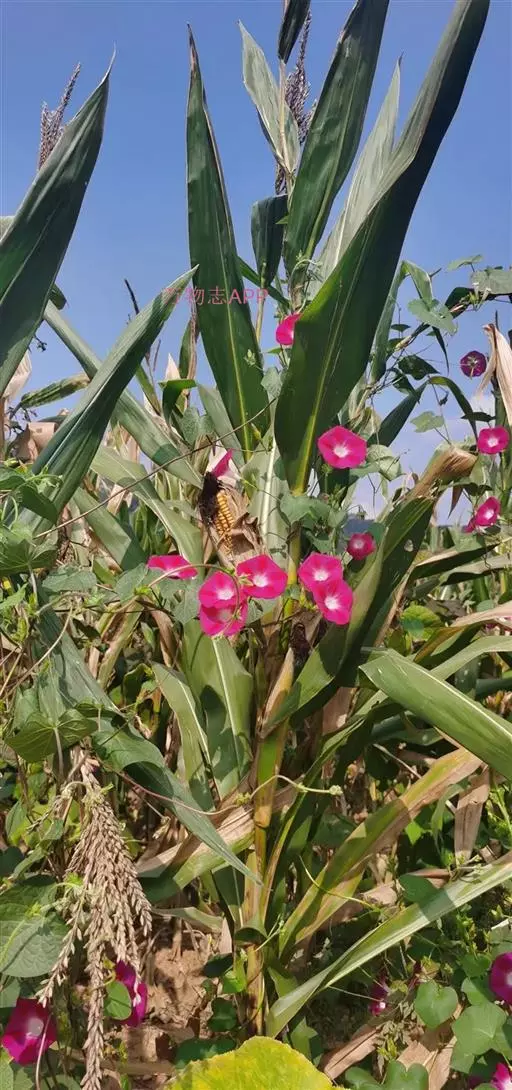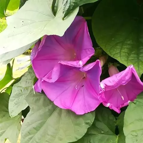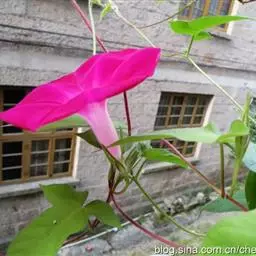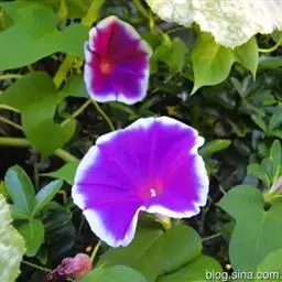 圆叶牵牛,叶阔心脏形,全缘,花型小,有白、玫红、莹蓝等色。