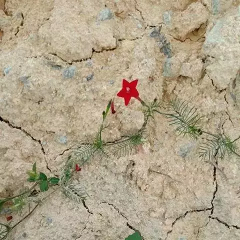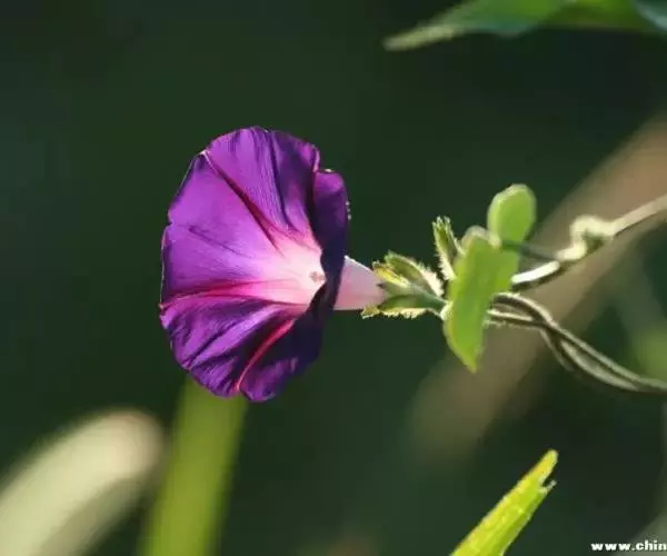 裂叶牵牛。叶具深三裂,花中型1~3朵腋生,有莹蓝、玫红或白色。