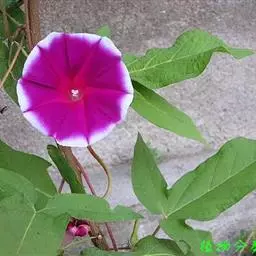 大花牵牛,叶大柄长,具三裂,中央裂片较大,叶易长具不规则的黄白斑块。花1~3朵腋生,总梗短于叶柄,花大型,花径可达10厘米或更大,原产亚洲和非洲热带。本种在日本栽培最盛,称朝颜花,并选育出众多园艺品种,花型变化多样,花色丰富多彩,各地广为流行。