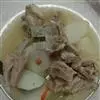 3.取一个煲加2/3清水进去,放到炉上用旺火烧开,把筒子骨和萝卜倒入煲里,加一小块的老姜(用刀侧面拍几下),花椒数粒,滴入几滴醋(好让骨头内的钙质更容易溶入汤内),大火烧开后可以用文火再炖1个半小时左右。