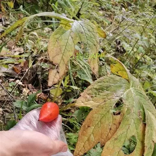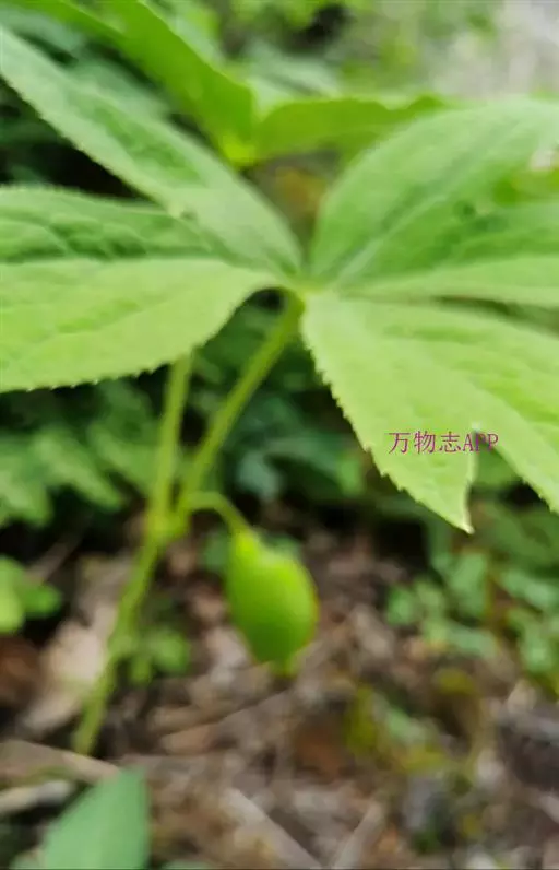 多年生草本,植株高20-50厘米。根状茎粗短,节状,多须根;茎直立,单生,具纵棱,无毛,基部被褐色大鳞片。叶2枚,薄纸质,非盾状,基部心形,3-5深裂几达中部,裂片不裂或有时2-3小裂,裂片先端急尖或渐尖,上面无毛,背面被柔毛,边缘具粗锯齿;叶柄长10-25厘米,具纵棱,无毛。花大,单生,先叶开放,两性,整齐,粉红色;萼片6,早萎;花瓣6,倒卵形或倒卵状长圆形,长2.5-3.5厘米,宽1.5-1.8厘米,先端略呈波状;雄蕊6,长约1.5厘米,花丝较花药稍短,花药线形,纵裂,先端圆钝,药隔不延伸;雌蕊1,长约1.2厘米,子房椭圆形,1室,侧膜胎座,含多数胚珠,花柱短,柱头头状。浆果卵圆形,长4-7厘米,直径2.5-4厘米,熟时桔红色;种子卵状三角形,红褐色,无肉质假种皮。花期5-6月,果期7-9月。