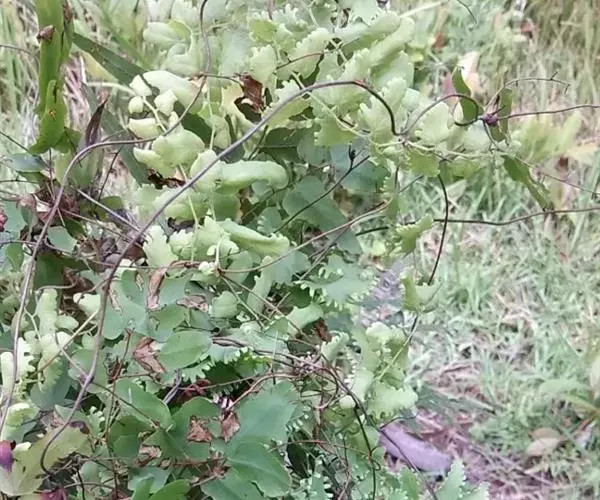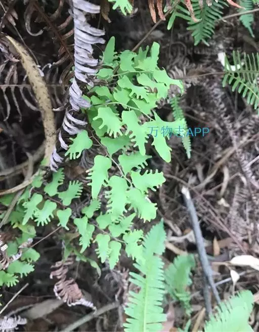 植株蔓攀,高达5-7米。叶轴纤细如铜丝,二回羽状;羽片多数,相距约7-9厘米,羽片对生于叶轴的距上,距长2-4毫米,顶端密生红棕色毛。不育羽片生于叶轴下部,长圆形,长7-8厘米,宽4-7厘米,柄长1-1.2厘米,奇数羽状,或顶生小羽片有时两叉,小羽片4对,互生,有2-4毫米长的小柄,柄端有关节,各片相距约8毫米,卵状三角形、阔披针形或长长圆形,先端钝,基部较阔,心脏形,近平截或圆形。边缘有矮钝齿,或锯齿不甚明显。叶脉清晰,三出,小脉2-3回二叉分歧,斜向上,直达锯齿。叶薄草质,干后暗黄绿色,两面光滑。能育羽片长圆形,长8-10厘米,宽4-6厘米,通常奇数羽状,小羽片的柄长2-4毫米,柄端有关节,9-11片,互生,各片相距7-10毫米,三角形或卵状三角形,钝头,长1.5-3厘米,宽1.5-2厘米。孢子囊穗排列于叶缘,到达先端,5-8对,线形,一般长3-5毫米,最长的达8-10毫米,黄褐色,光滑。