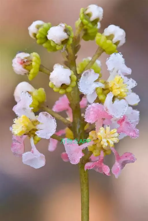 直立灌木,高约1米;嫩枝被乳突状小毛,老枝无毛。叶小,对生,革质,卵圆形至倒卵形,长6-15(-20)毫米,宽5-12(-15)毫米,先端圆形或截头状微凹,基部圆形或钝,叶面绿色,无毛,背面苍白色或淡褐色,边缘有刺状疏齿,或有时全缘;叶柄长0.5-1毫米;托叶针状,长约1毫米。花组成腋生的聚伞花序,或仅单花生于叶腋;花直径约1厘米,花梗纤细,四棱形,长于叶,中部以下具关节,有小苞片2;萼片5,卵状长圆形,外有大的腺体2枚,基部与花梗相接处被疏毛;花瓣5,初时淡红色,后变白色,长约8毫米,具长柄;雄蕊10,长约为花瓣的一半;子房无毛,花柱3,分离,但仅2枚发育,弯曲,柱头膨大。核果鲜红色,近球形,直径约8毫米。花期夏秋 。