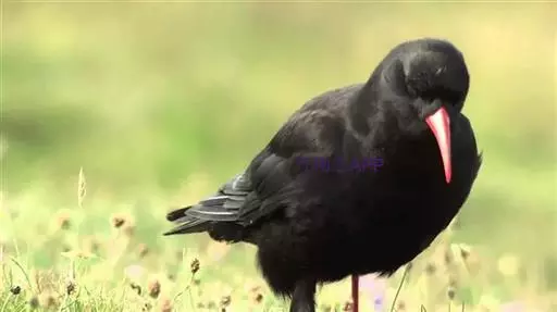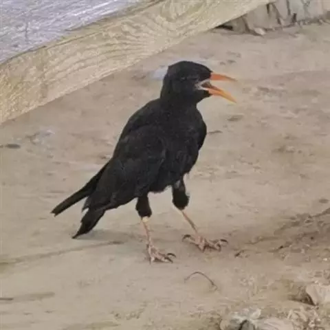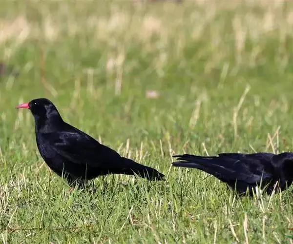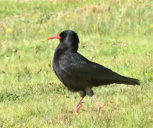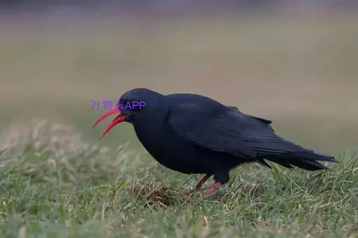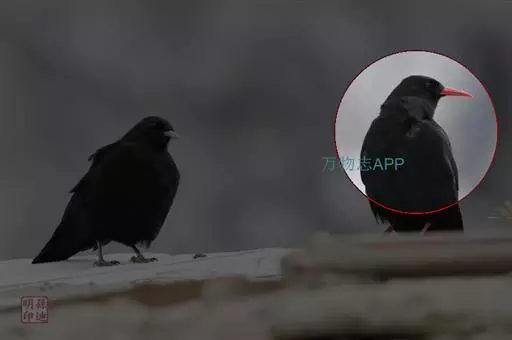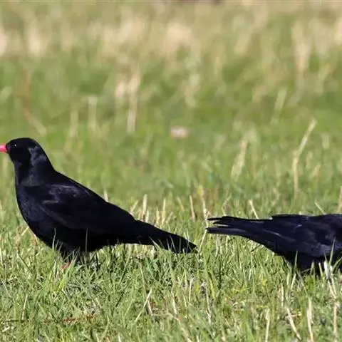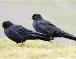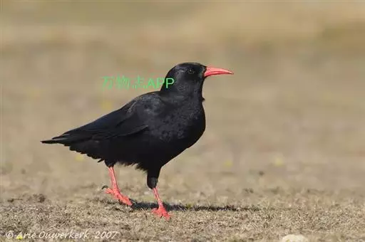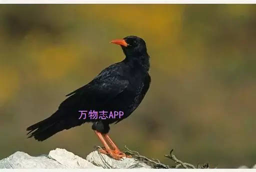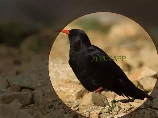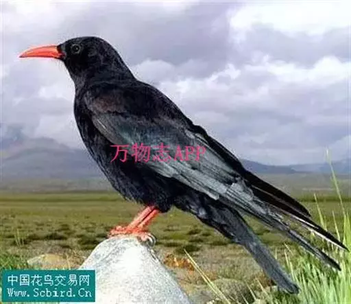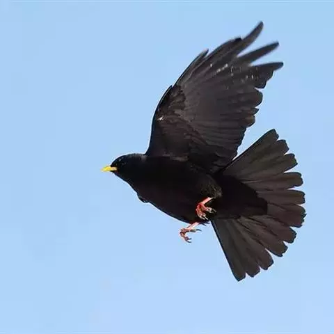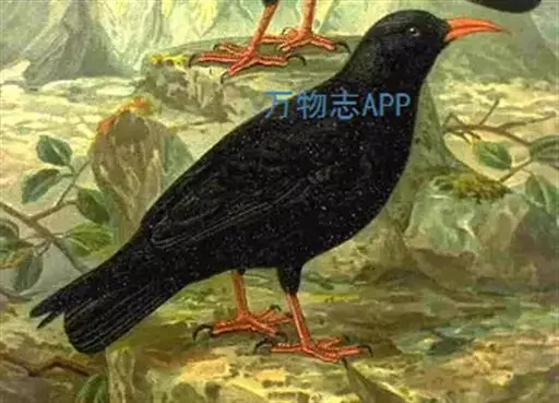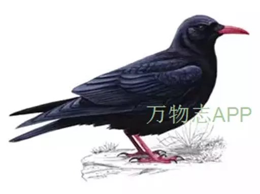 红嘴山鸦(学名:Pyrrhocorax pyrrhocorax): 大型鸦类,体长36-48厘米。嘴、脚红色,通体黑色具蓝色金属光泽。雌雄羽色相似,全身羽毛纯黑色具蓝色金属光泽。两翅和尾纯黑色具蓝绿色金属光泽。虹膜褐色或暗褐色,嘴和脚朱红色。相似种黄嘴山鸦嘴为黄色而不为红色,野外不难区别。