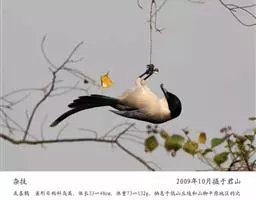 灰喜鹊:属雀形目、鸦科的中型鸟类。外形酷似喜鹊,但稍小。体长33-40厘米。嘴、脚黑色,额至后颈黑…