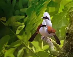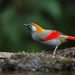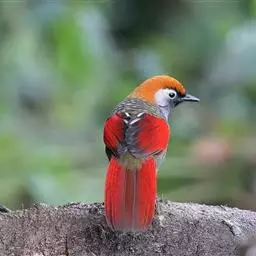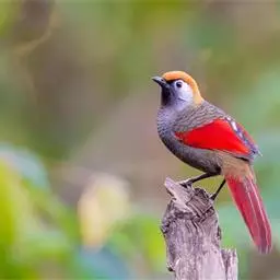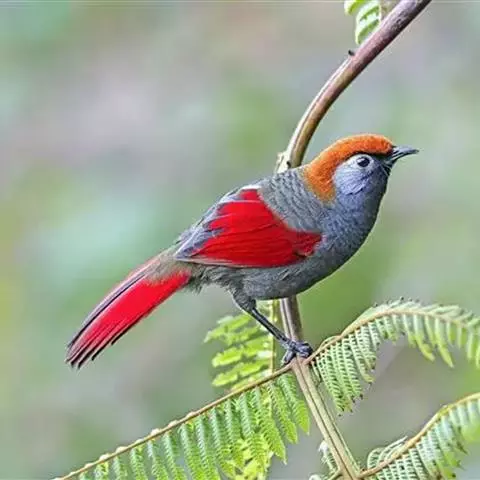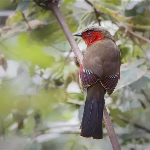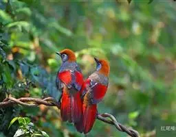赤尾噪鹛中型鸟类,体长24~28厘米。头顶至后颈红棕色,两翅和尾鲜红色,眼先、眉纹、颊、颏和喉黑色,…