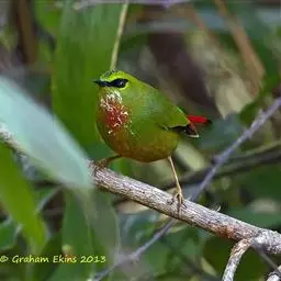 火尾绿鹛是莺科、绿鹛属小型鸟类,体长11-14厘米。上体绿色,头顶至枕具黑色鳞状斑,眼先和眼后黑色,…