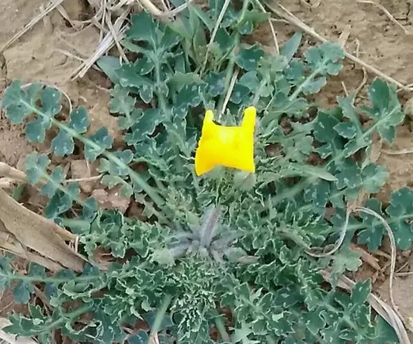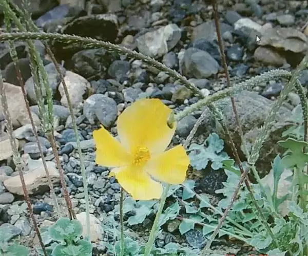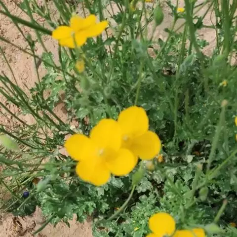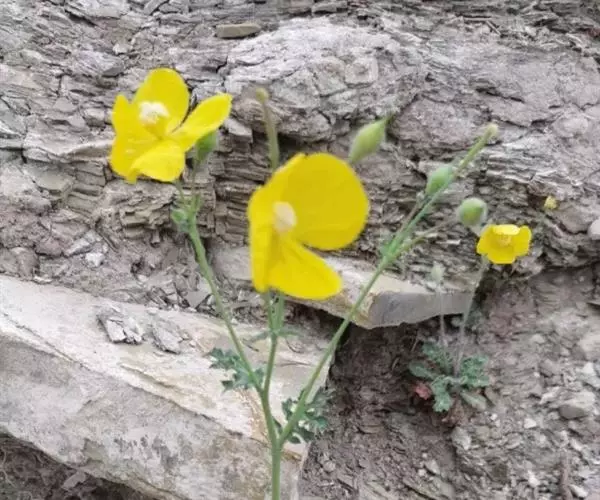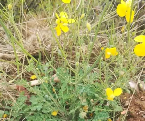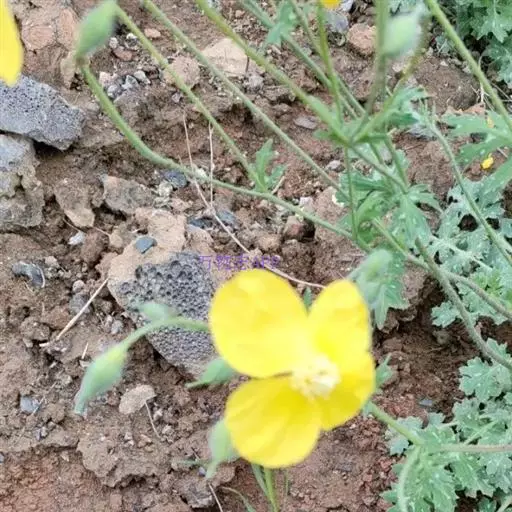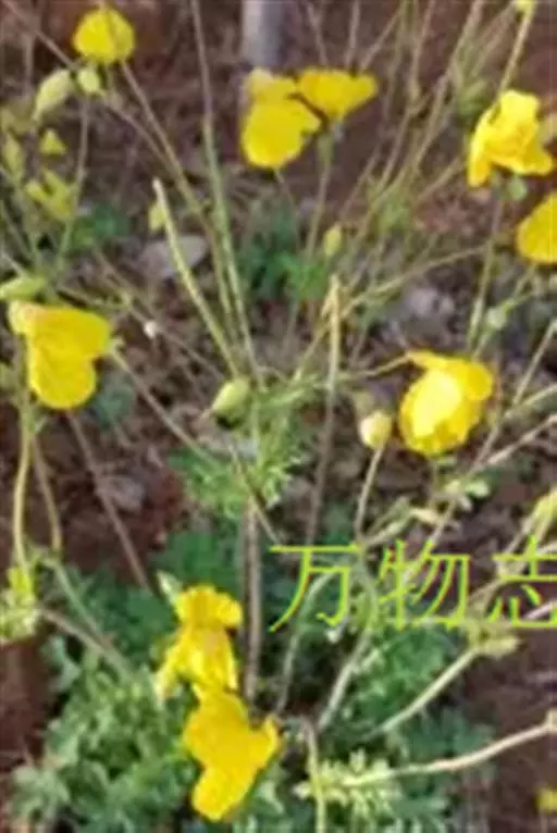 花1-5朵于茎和分枝先端排列成聚伞花序;花梗长2-2.5厘米,无毛;具苞片。花芽宽卵形,长约1厘米;萼片卵形.长0.6-1厘米,先端渐尖成距,距末明显扩大成匙形,无毛或被短柔毛;花瓣倒卵形至回形,长1-1.6厘米,宽1-1.3厘米,黄色;雄蕊多数,花丝丝状,长3-4毫米,花药长圆形,长1.5-2毫米,黄色;子房狭圆柱形,长约6毫米.绿色,密被疣状短毛,花柱短,柱头2裂,直立。蒴果线形,长4-7.5厘米,粗约2毫米,绿色,无毛,2瓣自顶端开裂至近基部。种子卵珠形,长约0.5毫米,红棕色,具网纹。花期3-5月,果期6-7月。