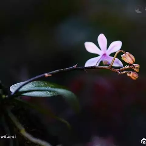 华西蝴蝶兰(拉丁学名:Phalaenopsis wilsonii Rolfe)又名小蝶兰、楚雄蝶兰。兰科,蝴蝶兰属附生草本植物,气生根长而弯曲,茎很短,叶稍肉质,长圆形或近椭圆形,花序柄暗紫色,花苞片膜质,萼片和花瓣白色带淡粉红色的中肋或全体淡粉红色;中萼片长圆状椭圆形,侧萼片与中萼片相似而等大,花瓣匙形或椭圆状倒卵形,蕊柱淡紫色,蒴果狭长,4-7月开花,8-9月结果。