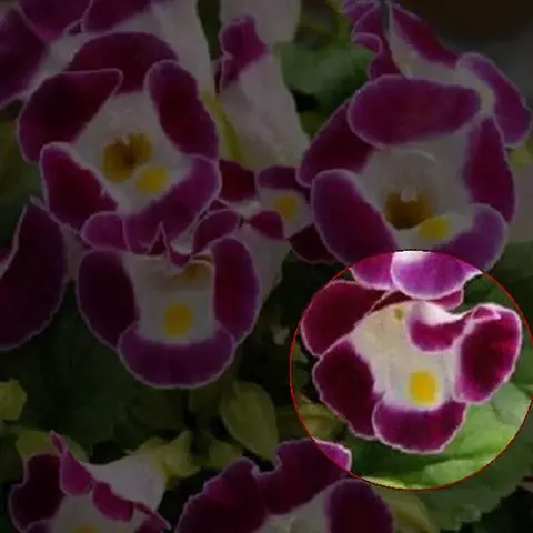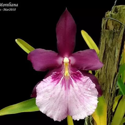 花序从茎的基部发出,常1-2个,斜立,长4-8.5厘米,不分枝,花序轴疏生2-5朵花;花序柄暗紫色,粗约2毫米,被1-2枚膜质鞘;花苞片膜质,卵状三角形,长4-5毫米,先端锐尖;花梗连同子房长3-3.8厘米;花开放,萼片和花瓣白色带淡粉红色的中肋或全体淡粉红色;中萼片长圆状椭圆形,长1.5-2厘米,宽6-7毫米,先端钝,具5条脉;侧萼片与中萼片相似而等大,但近唇瓣一侧的中部以下边缘下弯,基部贴生在蕊柱足上;花瓣匙形或椭圆状倒卵形,长1.4-1.5厘米,宽6-10毫米,先端圆形,基部楔形收狭;唇瓣基部具长2-3毫米的爪,3裂;侧裂片上半部紫色,下半部黄色,直立,狭长,长约6毫米,中部缢缩,上部扩大而先端斜截,在基部(两侧裂片之间)具1个中央对开的肉脊,其中间具穴并且向外(背面)隆起呈乳头状,内面中央的凸缘(脊突)黄色,其先端斜截并且具2至数个小缺刻;中裂片肉质,深紫色,摊平后呈宽倒卵形或倒卵状椭圆形,长8-13毫米,上部宽6-9毫米,先端钝并且稍2裂,基部具1枚紫色而先端深裂为2叉状的附属物,边缘白色、下弯而形成倒舟状,上面中央具1条纵向脊突,脊突在近唇瓣先端处强烈增厚而隆起;蕊柱淡紫色,长约6毫米,具长约3毫米的蕊柱足;药帽白色,前端稍伸长呈卵状三角形;花粉团2个,近球形,每个劈裂为不等大的2爿。