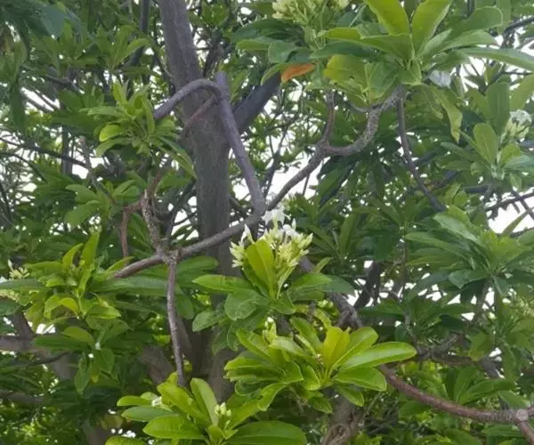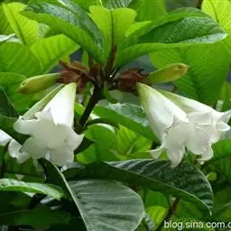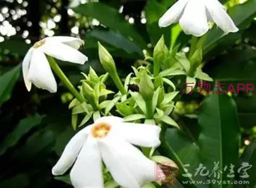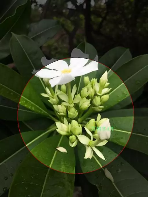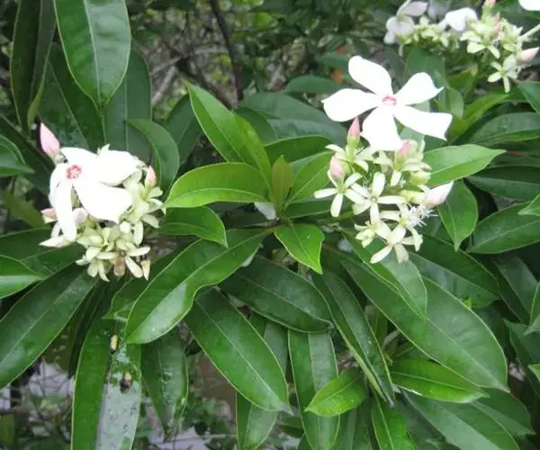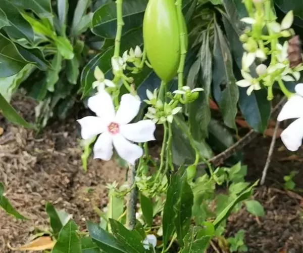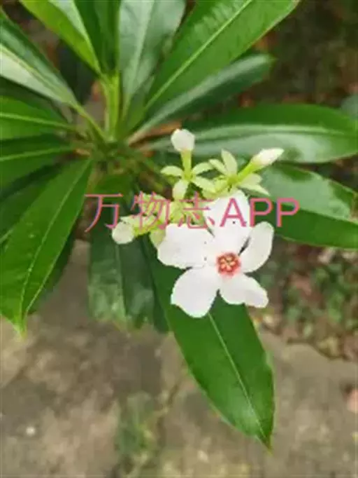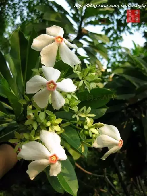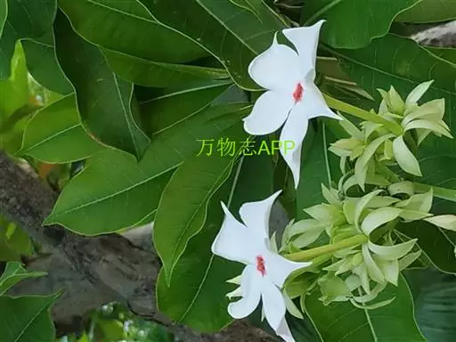 花白色,直径约5厘米,芳香;总花梗和花梗绿色,无毛,具不明显的斑点;总花梗长5-21厘米;花梗长1-2厘米;花萼裂片长圆形或倒卵状长圆形,顶端短渐尖或钝,长1.3-1.6厘米,宽4-7毫米,不等大,向下反卷,黄绿色,两面无毛;花冠筒圆筒形,上部膨大,下部缩小,长2.5-4厘米,直径:上部7-10毫米,下部约3毫米,外面黄绿色,无毛,内面被长柔毛,喉部染红色,具5枚被柔毛的鳞片,花冠裂片白色,背面左边染淡红色,倒卵状镰刀形,顶端具短尖头,长1.5-2.5厘米,宽:上面1.5-2.5厘米,下面约8毫米,两面无毛,水平张开;雄蕊着生在花冠筒喉部,花丝短,黄色,基部肋状凸起,花药卵圆形,顶端具短尖,基部圆形,向内弯;无花盘;心皮2,离生,无毛,花柱丝状,长2.3-2.8厘米,柔弱,无毛,柱头球形,基部环状,顶端浑圆而2裂。核果双生或单个,阔卵形或球形,长5-7.5厘米,直径4-5.6厘米,顶端钝或急尖,外果皮纤维质或木质,未成熟绿色,成熟时橙黄色;种子通常1颗。花期3-10月,果期7月至翌年4月。