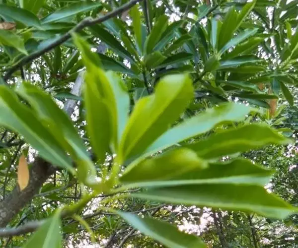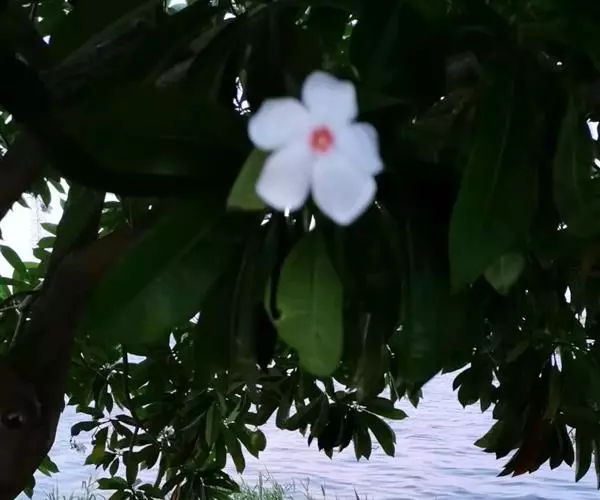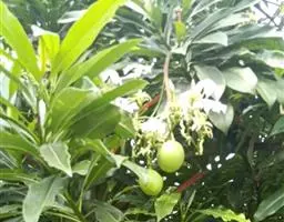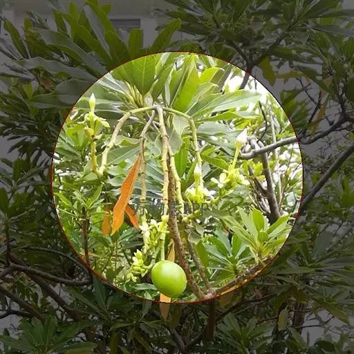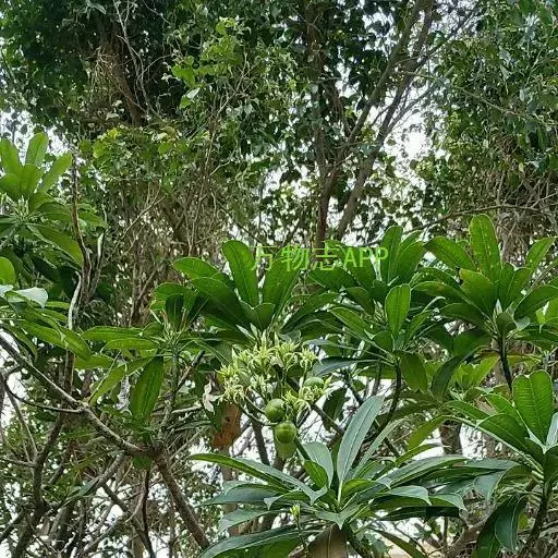 海杧果(学名:Cerbera manghas L.)是夹竹桃科海杧果属植物,乔木,高4-8米,胸径6-20厘米;树皮灰褐色;枝条粗厚,绿色,具不明显皮孔,无毛;全株具丰富乳汁。叶厚纸质,倒卵状长圆形或倒卵状披针形,稀长圆形,顶端钝或短渐尖。花白色,直径约5厘米,芳香;总花梗和花梗绿色,无毛,具不明显的斑点。核果双生或单个,阔卵形或球形;种子通常1颗。花期3-10月,果期7月至翌年4月。