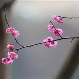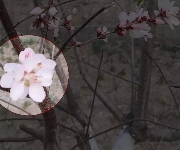 花序伞形总状,总梗极短,有花3-4朵,先叶开放,花直径3-3.5厘米;总苞片褐色,椭圆卵形,长6-7毫米,宽4-5毫米,两面被疏柔毛;苞片褐色,匙状长圆形,长约5毫米,宽2-3毫米,边有腺体;花梗长2-2.5厘米,被短柔毛;萼筒管状,长7-8毫米,宽约3毫米,被疏柔毛;萼片三角状长卵形,长约5毫米,先端渐尖,边有腺齿;花瓣白色或粉红色,椭圆卵形,先端下凹,全缘二裂;雄蕊约32枚,短于花瓣;花柱基部有疏柔毛。