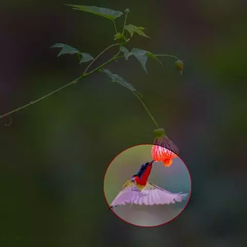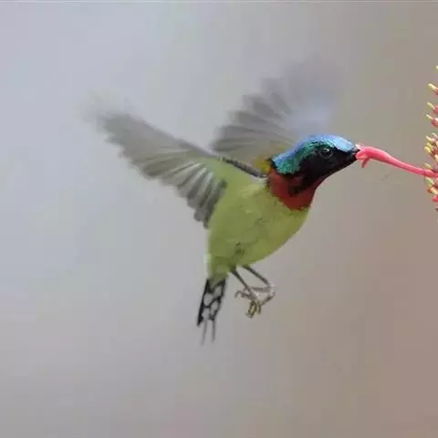 叉尾太阳鸟,雀形目太阳鸟科太阳鸟属留鸟;为小型鸟类,雄鸟头顶辉蓝绿色,上体橄榄绿色,腰明黄色,…