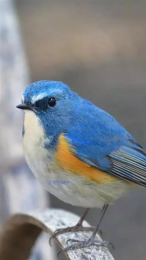 小型鸟类,体长13-15厘米。雄鸟上体从头顶至尾上覆羽包括两翅内侧覆羽表面概灰蓝色,头顶两侧、翅上小覆羽和尾上覆羽特别鲜亮呈辉蓝色。尾主要为黑褐色,中央一对尾羽具蓝色羽缘,外侧尾羽仅外翈羽缘稍沾蓝色,愈向外侧蓝色愈淡。翅上小覆羽和中覆羽辉蓝色,其余覆羽暗褐色,羽缘沾灰蓝色。飞羽暗褐色或黑褐色,最内侧二、三枚飞羽外翈沾蓝色,其余飞羽具暗棕或淡黄褐色狭缘。眉纹白色沾棕,自前额向后延伸至眼上方的前部转为蓝色,眼先、颊黑色,耳羽暗灰褐色或黑褐色、杂以淡褐色斑纹。下体颏、喉、胸棕白色,腹至尾下覆羽白色,胸侧灰蓝色,两胁橙红色或橙棕色。 雌鸟上体橄榄褐色,腰和尾上覆羽灰蓝色,尾黑褐色外表亦沾灰蓝色。前额、眼先、眼周淡棕色或棕白色,其余头侧橄榄褐色,耳羽杂有棕白色羽缘。下体和雄鸟相似,但胸沾橄榄褐色,胸侧无灰蓝色,其余似雄鸟。 虹膜褐色或暗褐色,嘴黑色,脚淡红褐色或淡紫褐色。 [2-3]