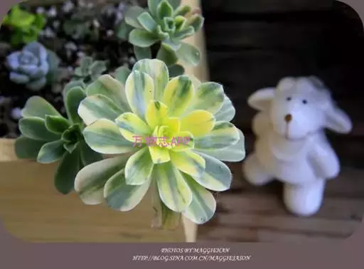 矮小灌木状植株。茎有落叶痕迹,半木质化有气生根, 叶片匙形, 颜色如同名字一样美丽,绿色的叶片中间含有黄色的锦斑。锦斑可能会消失,也可能完全锦斑化(全黄色),决定因素非常多,不可控。这是一种薄叶片的莲花掌属多肉植物,属于“冬种型” 多肉植物。圆锥花序,花黄色。