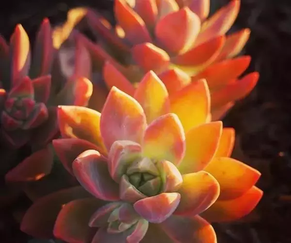 铭月在不同光照环境下会呈现出完全不同的颜色和外形。在阳光充足的环境下叶片边缘或全株呈金黄色至橘黄色,日照强烈环境下全株呈橘黄或橘红色,光照不足环境下叶片呈绿色且叶片间距拉长(徒长)。