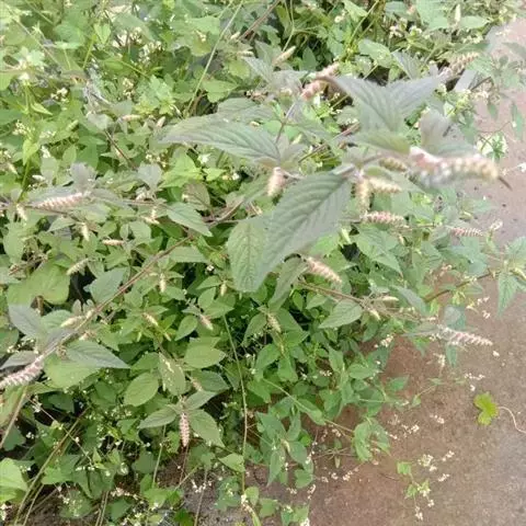 一年生草本,一年生草本。茎高0.3-1米,四棱形,多分枝,被灰白色疏短柔毛,茎下部的节及小枝基部通常微红色。叶通常为指状三裂,大小不等,长1-3.5厘米,宽1.5-2.5厘米,先端锐尖,基部楔状渐狭并下延至叶柄,裂片披针形,宽1.5-4毫米,中间的较大,两侧的较小,全缘,草质,上面暗橄榄绿色,被微柔毛,下面带灰绿色,被短柔毛,脉上及边缘较密,有腺点;叶柄长约2-10毫米。