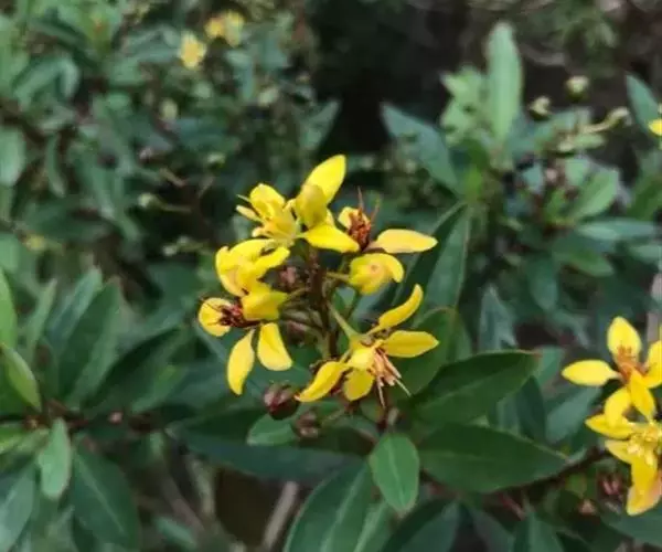 灌木,高1-2米;枝柔弱,淡褐色,嫩枝被褐色柔毛,老枝无毛。叶对生,膜质,长圆形或椭圆状长圆形,长1.5-5厘米,宽8-20毫米,先端纯或圆形,具短尖,基部楔形,有2枚腺体,侧脉每边4-5条,不明显;叶柄长约1厘米;托叶针状,长2-3毫米。总状花序顶生,花序轴被红褐色柔毛;苞片长约3毫米,宿存;花梗长7-13毫米,被红褐色毛,中间具关节,有小苞片2枚;花直径1.5-2厘米,全部无毛;萼片卵圆形,长2-2.5毫米,阔1-1.5毫米;花瓣黄色,长圆状椭圆形,长7-8毫米,中脉明显,花丝基部稍扩大,无毛,黄色,长2.5-4毫米,花药长2-2.5毫米;子房直径2-3毫米,花柱圆柱形,长5-6毫米。蒴果球形,直径约5毫米。花期8-9月,果期10-11月。