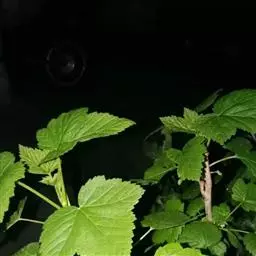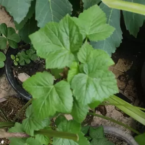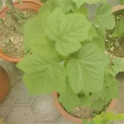 叶圆状肾形至倒卵圆形,长2-5cm,宽几与长相似,基部楔形,稀近圆形或截形,幼时两面均具短柔毛,并常有腺体,成长时柔毛渐脱落,至老时近无毛,掌状3-5深裂,裂片形状不规则,先端稍钝,顶生裂片稍长或与侧生裂片近等长,边缘具粗钝锯齿;叶柄长 (0.5) 1-2cm,被短柔毛。