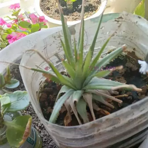 茎短。叶多数,莲座式排列,剑形,长40-90厘米,宽4-7厘米,顶端渐尖,全缘或有锐齿,腹面绿色,背面粉绿色,边缘和顶端常带褐红色,生于花序顶部的叶变小,常呈红色。