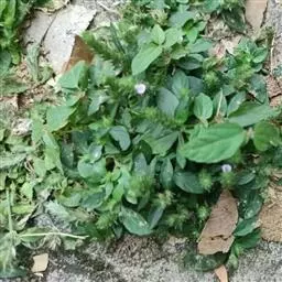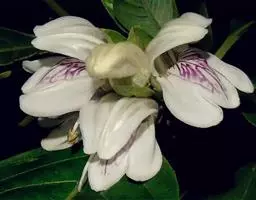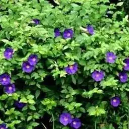 山牵牛 植株 攀缘灌木,分枝较多,可攀援很高,匍枝漫爬,小枝条稍4棱形,后逐渐复圆形,初密被柔毛,主节下有黑色巢状腺体及稀疏多细胞长毛。叶具柄,叶柄长达8厘米,被侧生柔毛;叶片卵形、宽卵形至心形,长4-9(15)厘米,宽3-7.5厘米,先端急尖至锐尖,有时有短尖头或钝,边缘有2(4)-6(8)宽三角形裂片,两面干时棕褐色,背面较浅,上面被柔毛,毛基部常膨大而使叶面呈粗糙状,背面密被柔毛。通常5-7脉。