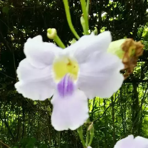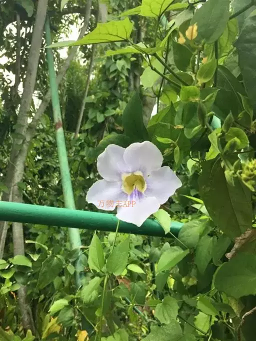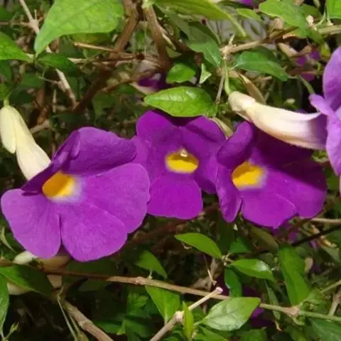 管理:山牵牛喜湿润的土壤环境,忌渍水,生长旺盛阶段应保证水分的供应。其对肥料的需求量较多,除在定植时施用基肥外,生长旺盛阶段可以每隔2-3周追肥一次。休眠期间无需追肥。由于山牵牛的植株高大,因此先用嵌有钢筋的水泥柱搭好支架,必须要保证其坚固耐用,以免出现伤人事件。待植株上架时,应该及时用细绳将新梢固定。并根据其生长状态进行牵引,以保证枝蔓能够爬满整个棚架。在冬末春初要进行轻剪。每年应该进行修剪。该种寿命较长,如有树势衰退、不爱开花等现象发生时,可以考虑进行更新。注意不要连作,最好换地种植。在良好的管理条件下,山牵牛不易患病,亦较少受到有害动物的侵袭。