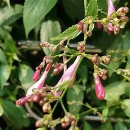 多年生草本或直立灌木,多分枝,茎4棱,明显具沟,绿色,疏被硬毛.叶无柄,卵形,倒卵状披针形,顶端渐尖或尾尖,基部收缩提琴形,下延,圆钝,心形,边缘具锯齿,两面疏被硬毛,上面绿色光亮,具瑰红色侧脉12-15对,嫩叶背面红紫色, 穗状花序腋生,长2-3厘米,花密,苞片长4-8毫米,宽卵形,较花萼短,宿存,小苞片和花萼线形,被腺毛-疏柔毛,花萼不等5裂至中部,裂片线条形,长约7毫米,钝;花冠长3-4厘米,略弯曲,堇色,冠管短而狭,向上逐渐扩大,稍稍一面膨胀,喉部径约2.5厘米.冠檐裂片5,短,具一白色的龙骨瓣,侧裂片宽过于长,外卷;雄蕊4,2强,2长雄蕊能育,花粉超长球形,网状纹饰具隔带状,微扭转(据陈少卿8202,采自广州)。2短雄蕊的花药败育(或空)。花丝极光滑无毛,子房近无毛。
