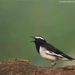 日本鹡鸰:体长约20厘米。上体多黑色,额、颏及眉纹白,下体白,两翼黑而具白色横斑及羽缘,…