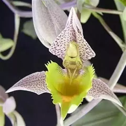 总状花序具12-32朵花,长13-23厘米;花苞片披针形,先端渐尖。最下部的长于子房;子房圆柱状,上部钩曲,连花梗长1.6-1.8厘米;花较大,绿白色或白色;中萼片直立,舟状,圆状心形,长6-7毫米,宽5-6毫米,先端钝,基部具5脉;侧萼片张开,斜卵形,长7.5-8毫米,宽4-4.5毫米,先端急尖,具5脉。