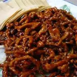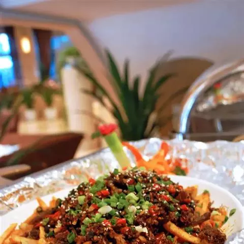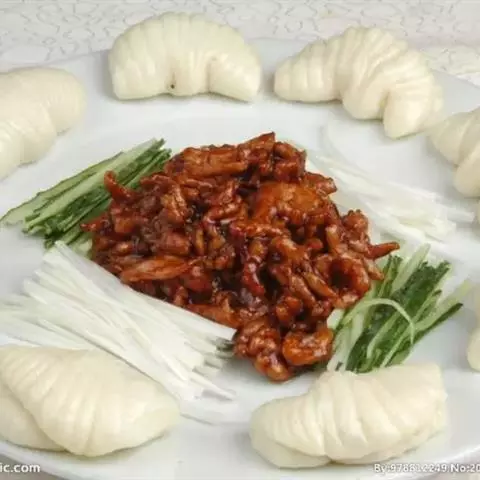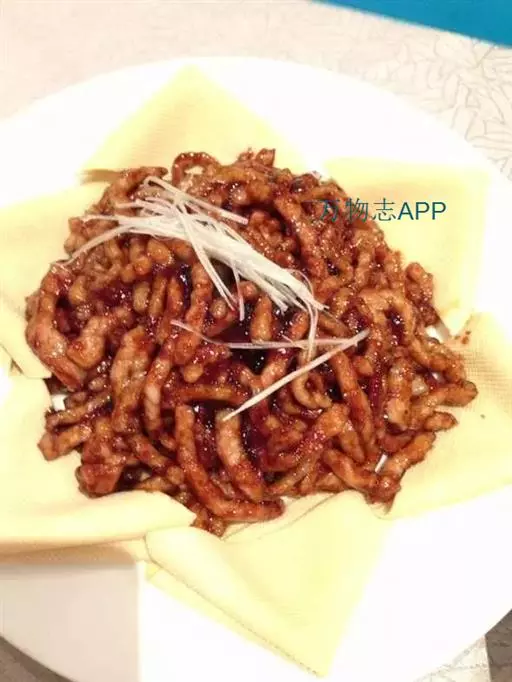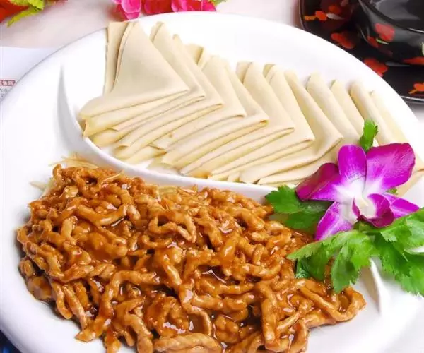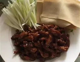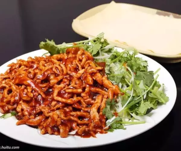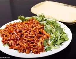 京酱肉丝精选里脊肉为主料,用酱爆烹制而成。食用时辅以葱丝、腐皮,口味咸甜适中,酱香浓郁,风味独特。